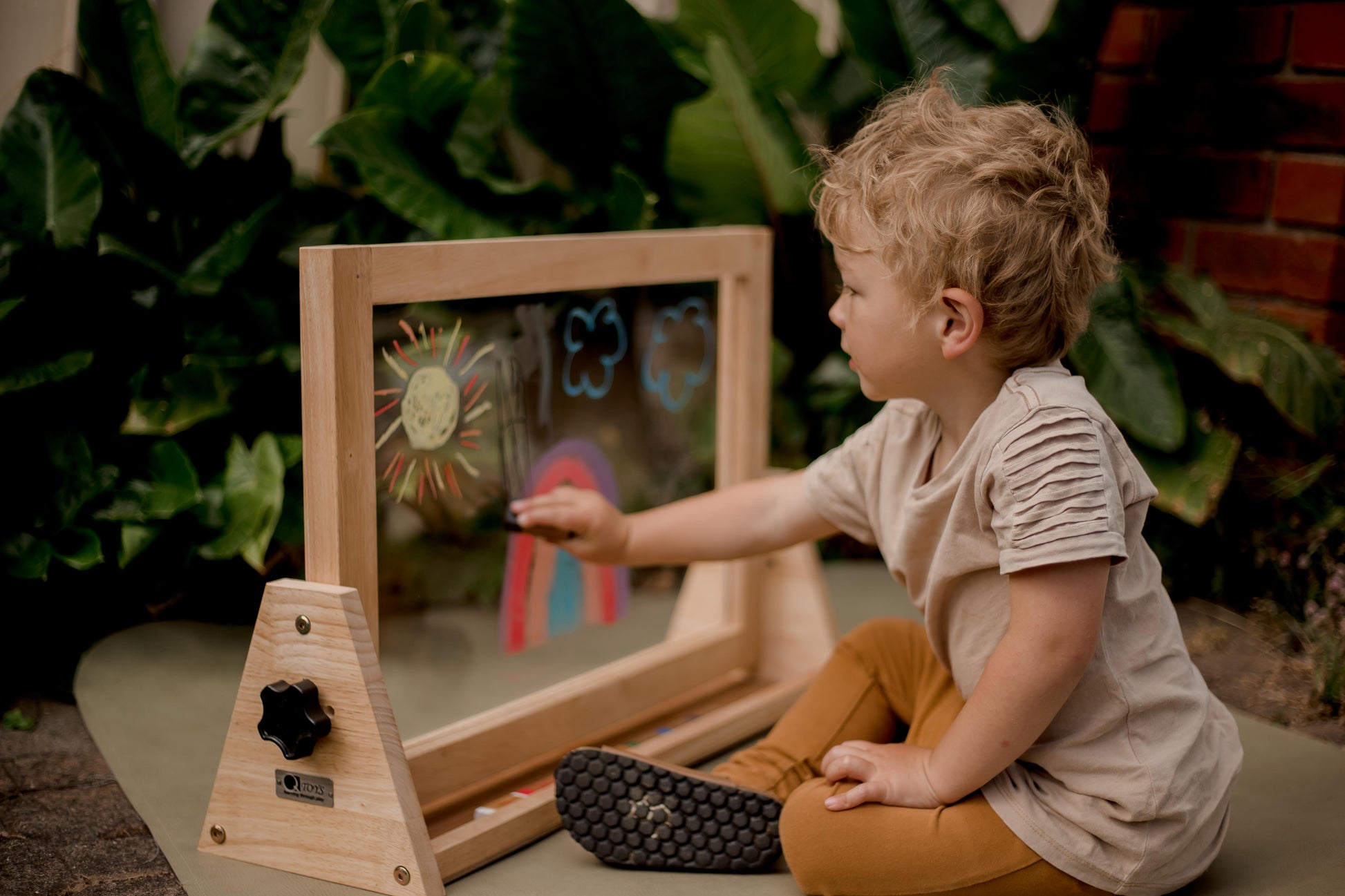 Our table easel has 4 functions. It contains a white board and a chalkboard which is magnetic. And last the acrylic insert for which you can use water-based paints on. This table easel is made from Australian timber. This easel therefore gives you plenty of options for your children to express themselves creatively in different ways from using paints to chalk or even magnets.